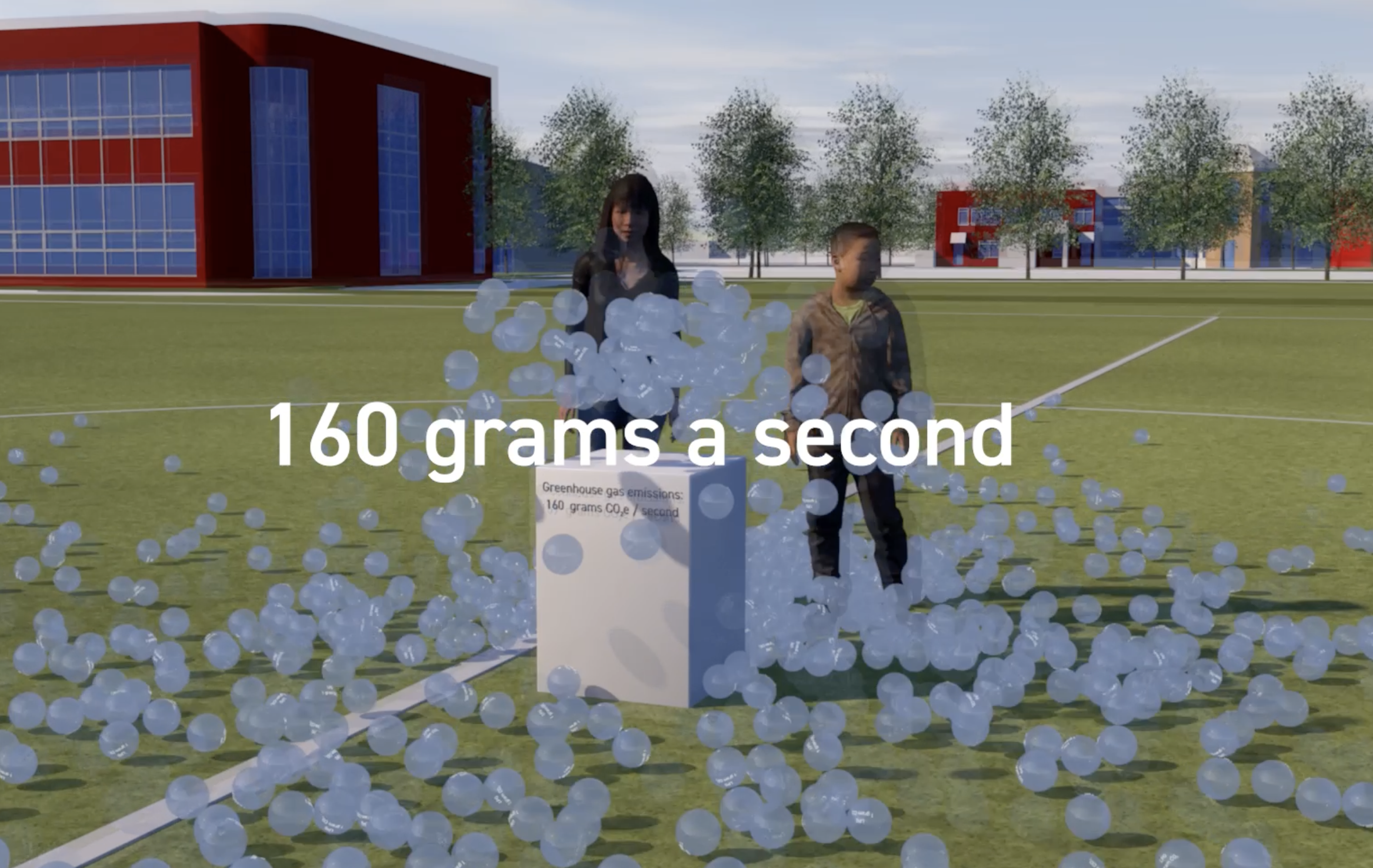 We were fortunate that the school asked their architect to develop a 3D model of its campus. This meant more of our budget could be spent on the animation itself. The animation first shows the ‘footprint’ of the school in real-time as one gram ‘bubbles’ emerging from the ground, then switches to one kilogram (one metre diameter) spheres in the school playing fields representing one day’s emissions. Finally the annual carbon emissions are shown dwarfing the school campus.